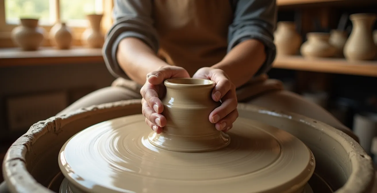 Viele Anfänger suchen die Lösung in mehr Kraft oder endlosen Wiederholungen. Sie probieren vielleicht sogar verschiedene Tonmassen aus, von fein schamottiert bis ganz glatt, in der Hoffnung, dass das Material das Problem löst. Doch die Wahrheit ist subtiler und technischer. Der Durchbruch beim Töpfern an der Scheibe ist kein Kampf, den man mit Gewalt gewinnt, sondern ein Dialog mit dem Material. Es geht darum, die Physik des Tons und die Biomechanik des eigenen Körpers zu verstehen und für sich zu nutzen.