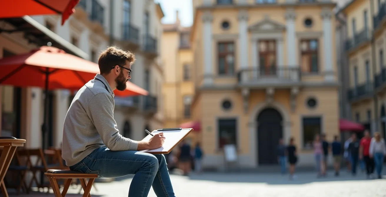 Indem Sie diese Tricks und Denkweisen anwenden, verwandeln Sie das Zeichnen in der Öffentlichkeit von einer Prüfung in ein Spiel. Es geht nicht mehr darum, ob die Skizze „gut“ wird, sondern darum, den Moment der Beobachtung zu geniessen. Schnappen Sie sich also Ihr minimalistisches Kit, suchen Sie sich eine scheinbar unspektakuläre Ecke und geben Sie dem 70-Jährigen und dem 3-Jährigen in Ihnen ihre gemeinsame Mittagspause. Beginnen Sie noch heute Ihre 5-Minuten-Challenge und entdecken Sie die Welt um sich herum mit neuen Augen.